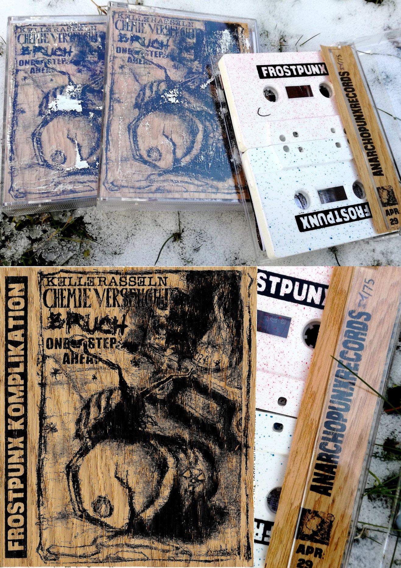 Es soweit: Pünktlich zum Frostpunx 2018 erscheint der Doppeltape-Sampler »Frostpunx Komplikation« auf dem die Kapellen Bruch und One Step Ahead, sowie Kellerasseln und Chemieverseucht einen wunderbaren Rückblick auf das Frostpunx geben, das nun ein Jahr zurückliegt. Dementsprechend interpretiert das Artwork anekdotenhaft nicht nur den Abend, sondern auch die Bands.