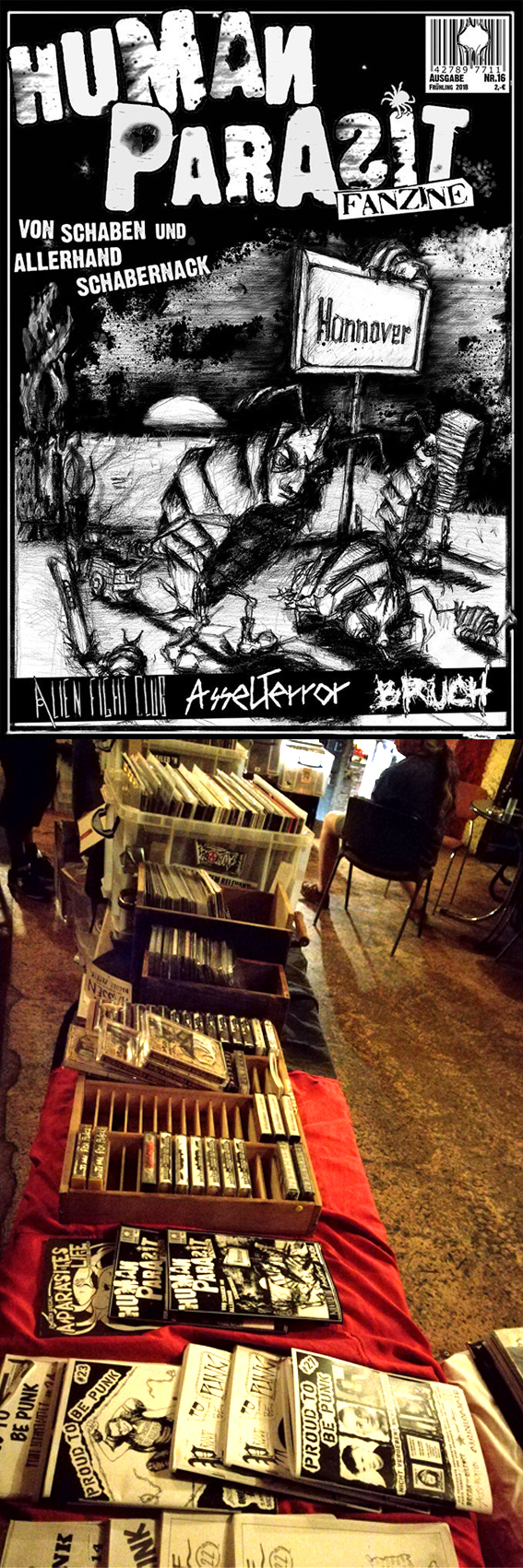 Einige Zeit ist ins Land gestrichen und Einiges hat sich getan: Zuerst gab es eine Covergestaltung für‘s Human Parasit Fanzine auf die Augen. Das sehr informative und witzige Heftchen beinhaltet Interviews mit unter anderem „Asselterror“; „Bruch“ und „Alien Fightclub“, sowie verschiedenster Reviews und Konzertberichte. Das Fanzine gibt es bei uns für symbolische zwei Ocken zu kaufen. Des Weiteren gab es wieder mal eine Teilname an einer Plattenbörse zu verzeichnen. Dieses Mal beim G.I.G. in Halle. Danke an Stani von SM Musik für die Organisation und die Einladung.